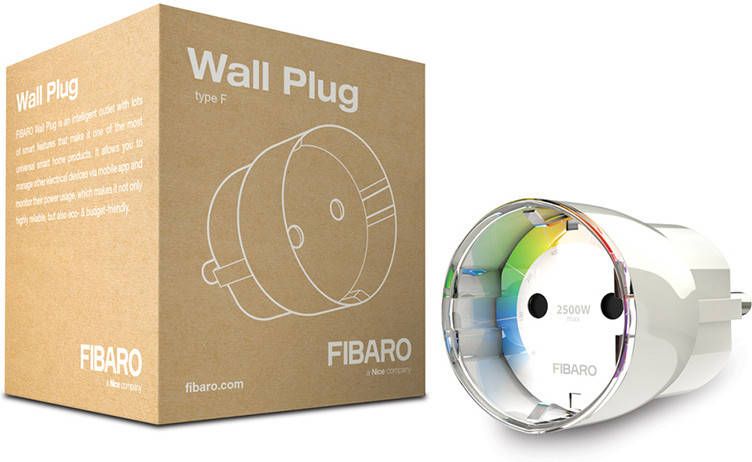 De Fibaro Wall Plug is een universele, Z-Wave compatibel, relaisschakelaar in de vorm van een normale stopcontact aansluiting. De Plug kan worden gebruikt om een apparaat te bedienen tot een maximaal vermogen van 2,500W. De Plug meet het stroomverbruik en maakt gebruik van een kristallen LED ring, deze veranderd van kleur om de huidige belasting weer te geven. De Fibaro stekker kan worden bediend met behulp van de service knop op de behuizing, of via een Z-Wave compatibele controller.