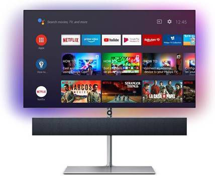 De Philips 65OLED984/12 is een 4K Ultra HD OLED televisie waarmee je nog meer op gaat in prachtige beeldkwaliteit en een grotere kijkhoek. Dankzij het 4 zijdige Philips Ambilight geniet je met nog meer emotie van beelden.En een beeld dat zo levensecht is, vraagt om levensecht geluid. Het exclusieve luidsprekerdesign van de legendarische audio-ingenieurs Bowers & Wilkins levert ongekend levensechte prestaties. Een geïntegreerde subwoofer, tweeters en drivers met volledig bereik produceren diepe, goed gedefinieerde bastonen, scherpe dialogen en kristalheldere hoge frequenties. Zelfs bij een laag volume. De TV, de soundbar, de bevestiging aan de metalen standaard, het geheel is een blikvanger in je kamer. Google Play Store en de Philips App Gallery.Breid het gewone aanbod TV-programma's uit met Google Play Store en Philips App Gallery. Geniet eindeloos van films, TV, muziek, apps en games online.Perfecte kleurenweergaven dankzij Philips OLEDPhilips OLED is de nieuwste generatie tv-technologie, met diepere zwarttinten, betere kleuren en verbazingwekkend contrast, wat resulteert in een zuiver en levensecht beeld. In tegenstelling tot conventionele LED-TV's heeft OLED geen achtergrondverlichting nodig. Dankzij de organische, lichtgevende technologie kunnen pixels volledig worden uitgeschakeld en komt er geen licht door wat zorgt voor perfecte detail.4K Ultra HD Premium beeldkwaliteitUltra HD Premium brengt je HDR-content tot leven. Geniet van een scherper, meer gedetailleerd en realistischer beeld met meer dan een miljard kleuren, waardoor je nog meer diepte en levendigheid te zien krijgt. Dynamische metagegevens zorgen dat je TV de helderheidniveaus van frame tot frame aanpast. Van heldere luchten tot kaarsverlichte tempels — kleuren zijn levensecht. Originele details blijven behouden en het contrast is perfectDolby Vision en Dolby Atmos.Met de ondersteuning voor Dolby's eersteklas geluid en videoformats klinkt en lijkt alles wat je in HDR kijkt levensecht. Of je nu kijkt naar de nieuwste streamingseries of een Blu-ray Disc-set, je kunt genieten van het contrast, de kleur en de helderheid zoals de regisseur het heeft bedoeld.Bestuur de TV met je stemDankzij Google Assistant bedien je deze Philips Android TV eenvoudig met je stem. Of je nu Netflix wilt kijken, een game wilt spelen of apps wilt zoeken in de Google Play Store; zeg het tegen de TV en hij voert je opdracht uit. Daarnaast bedien je ook moeiteloos jouw slimme apparaten die geschikt zijn voor Google Assistant. En dat allemaal vanaf de bank!.